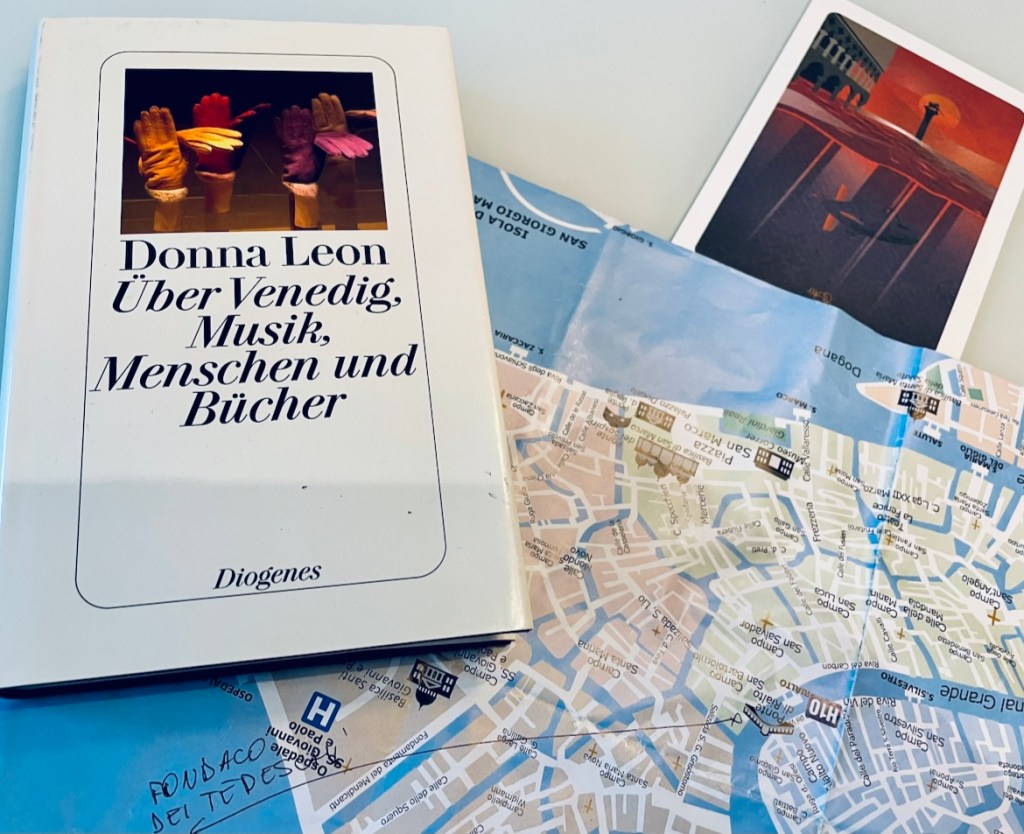 Im Nachtzug bereitete ich mich mit Donna Leons „Über Venedig, Musik, Menschen und Bücher“ vor – ein kurzweiliges Buch, in dem sie aus Venedigs Nähkästchen plaudert. In Kleinigkeiten beweist sie großes Gespür für Atmosphärisches, prangert aber auch Mißstände an und haut ihren italienischen Nachbarn auch schon mal derbe Schimpfworte um die Ohren, wenn diese ohne mit der Wimper zu zucken ihren Müll in den Kanal werfen. Die Geschichten wurden fast alle Anfang/Mitte der 1990er geschrieben und ich hatte das Gefühl, Müll wird heute glücklicherweise wenig in den Kanälen versenkt, die sahen einigermaßen sauber aus. Spannend fand ich auf jeden Fall die Geschichte vom Turmwächter von San Marco, der Philosophie studierte und eine sehr spannende Persönlichkeit zu sein scheint.